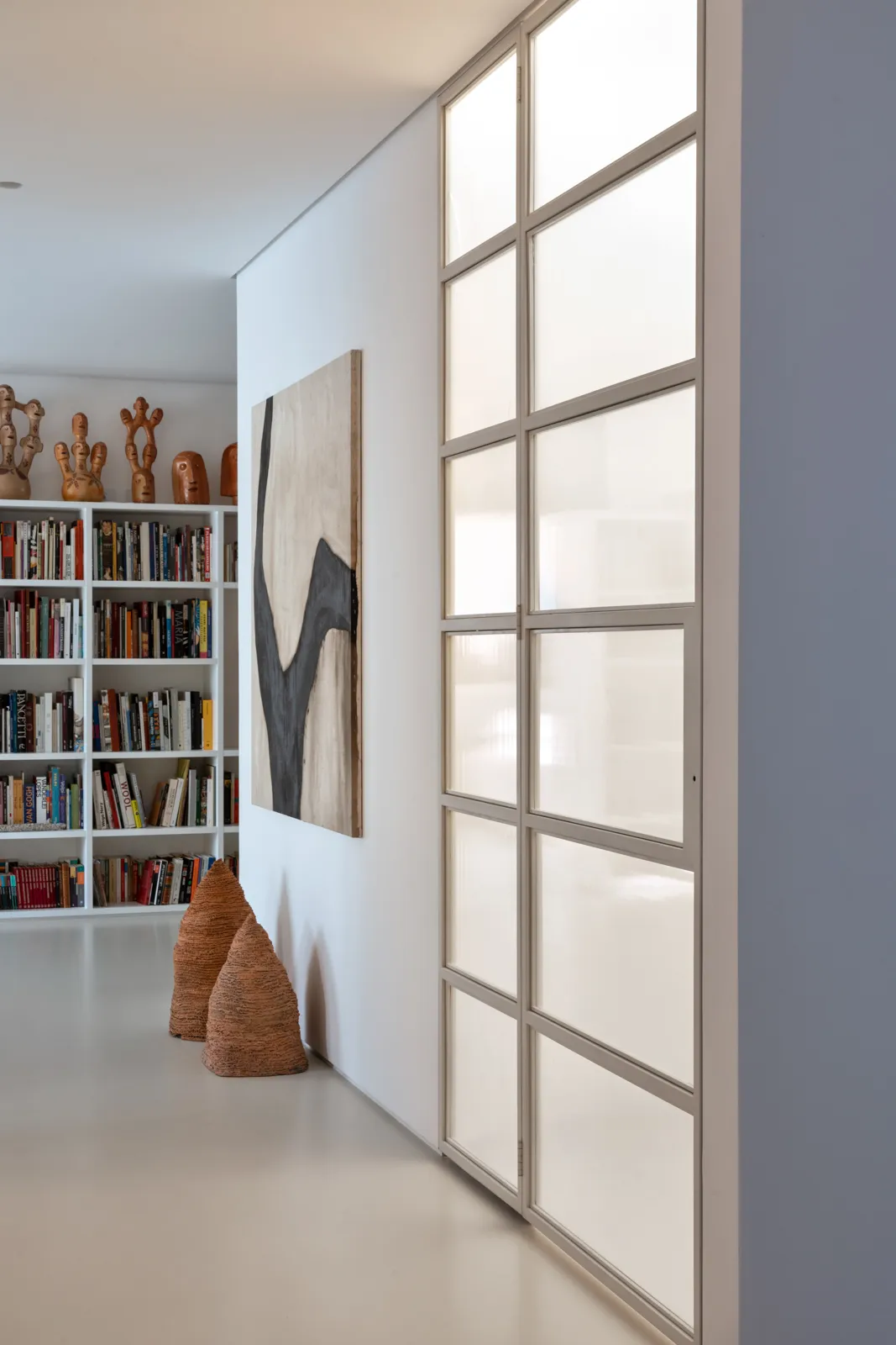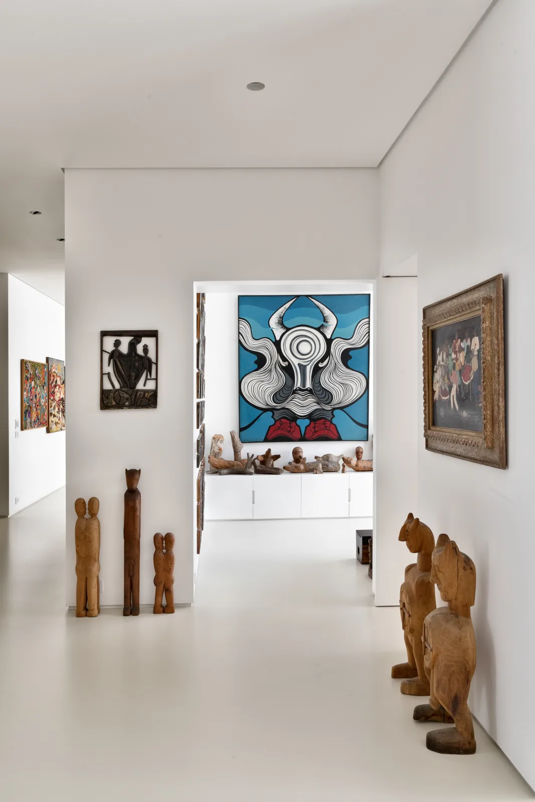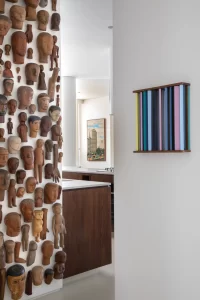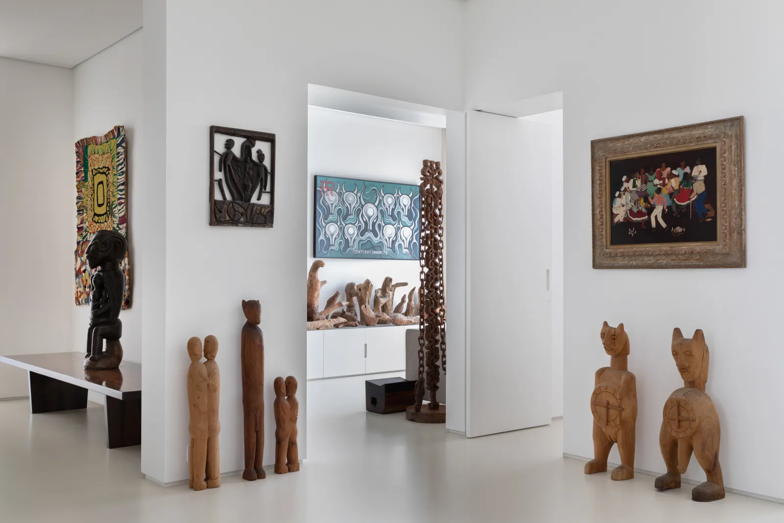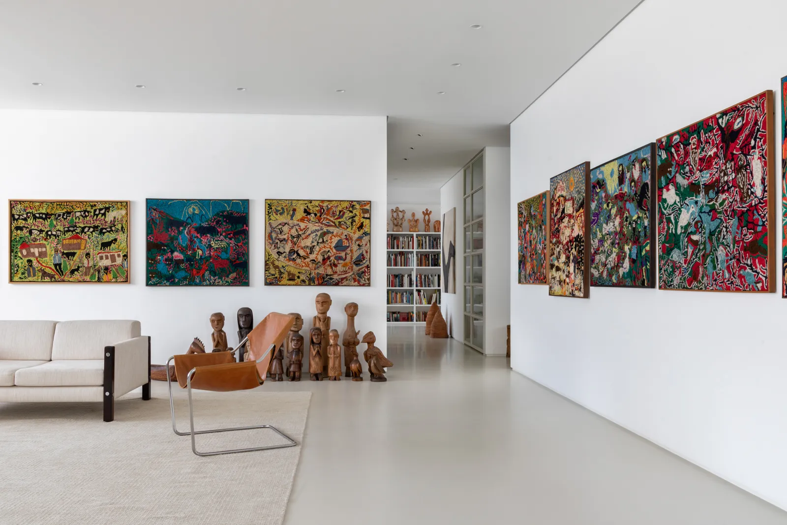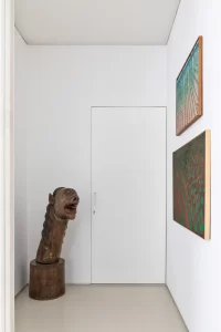 A grande estante funciona como o único filtro físico do espaço, abrigando o acesso às suítes, enquanto o restante do apartamento se mantém fluido e integrado. Paredes brancas e piso contínuo de resina clara servem como fundo neutro para a coleção, com acentos pontuais de madeira, pedra e mobiliário vintage. A ausência de hierarquia entre as obras se reflete na concepção espacial: um conjunto único, pensado para crescer junto com a coleção e permanecer acessível aos visitantes.