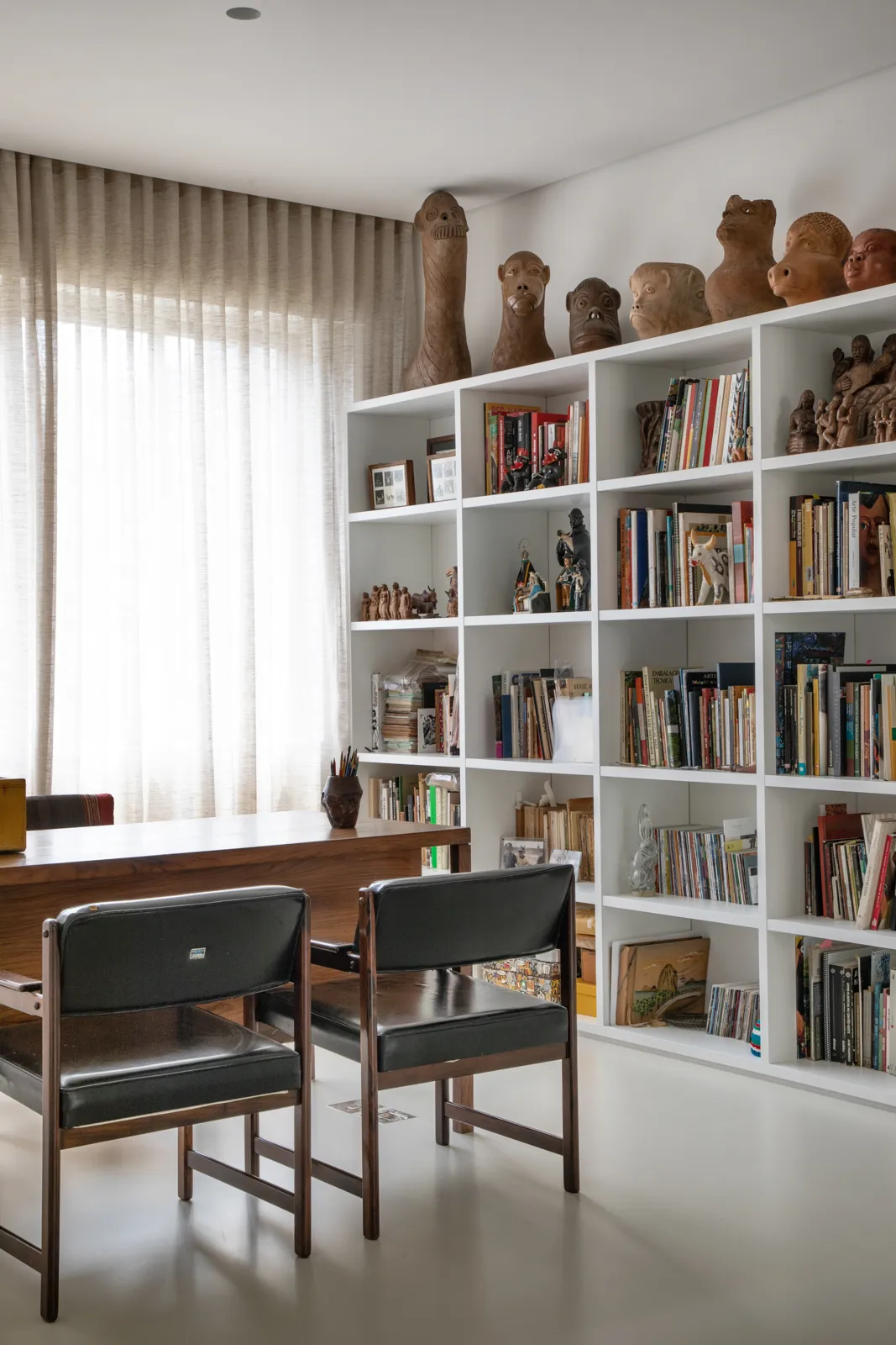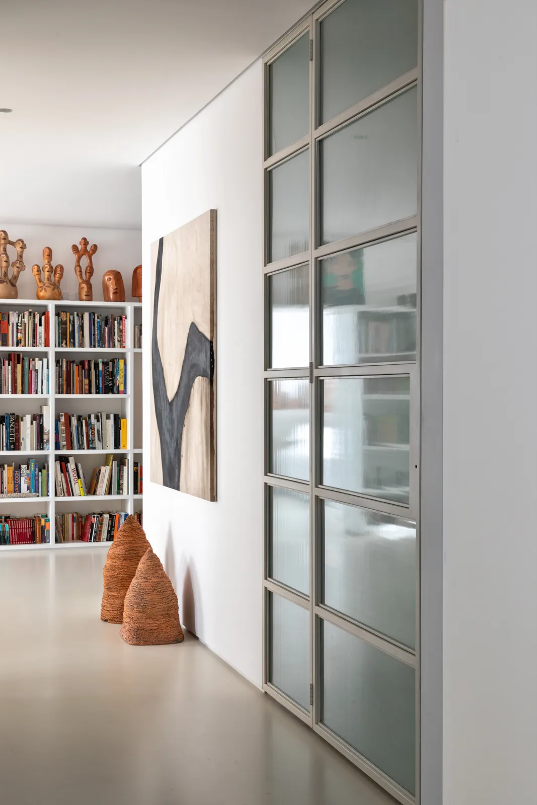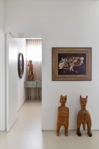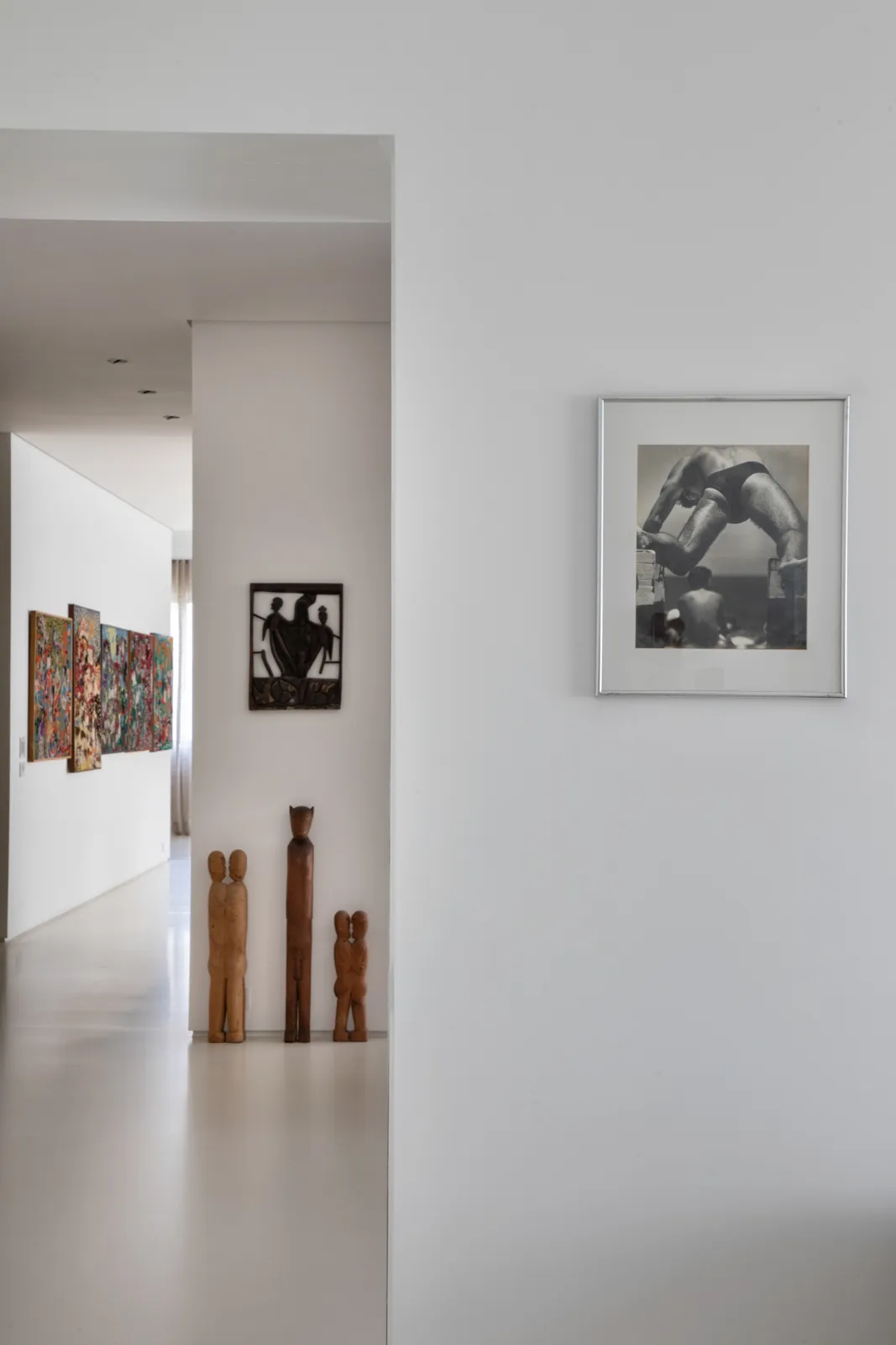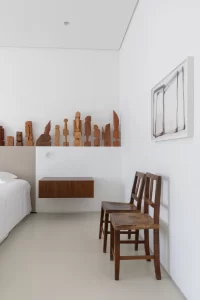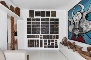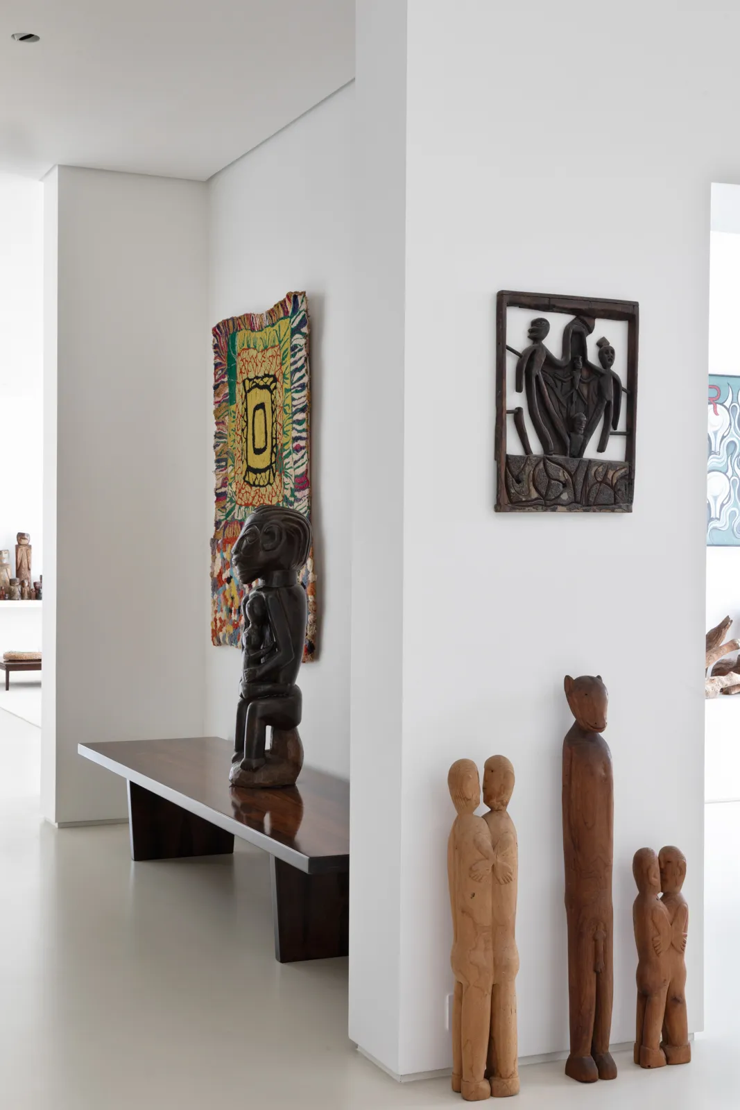 A grande estante funciona como o único filtro físico do espaço, abrigando o acesso às suítes, enquanto o restante do apartamento se mantém fluido e integrado. Paredes brancas e piso contínuo de resina clara servem como fundo neutro para a coleção, com acentos pontuais de madeira, pedra e mobiliário vintage. A ausência de hierarquia entre as obras se reflete na concepção espacial: um conjunto único, pensado para crescer junto com a coleção e permanecer acessível aos visitantes.