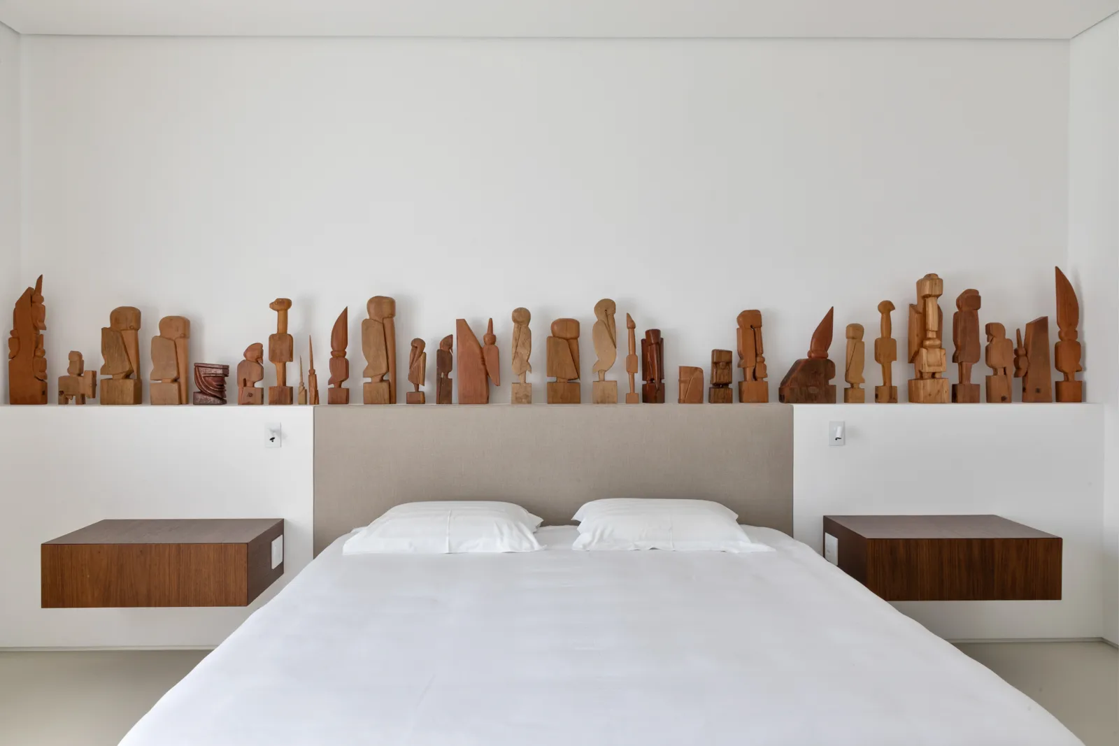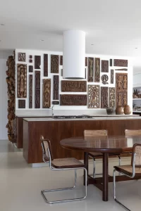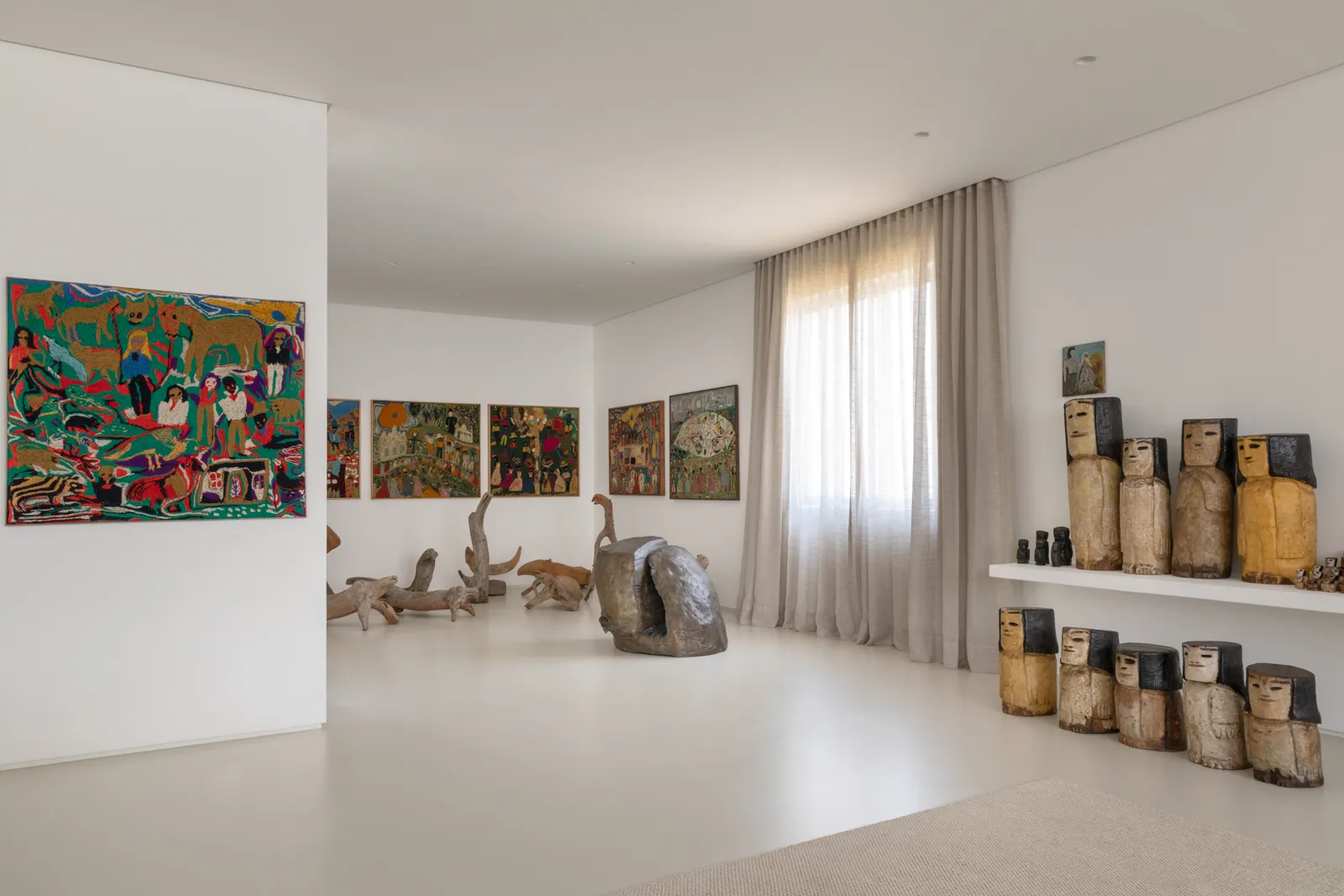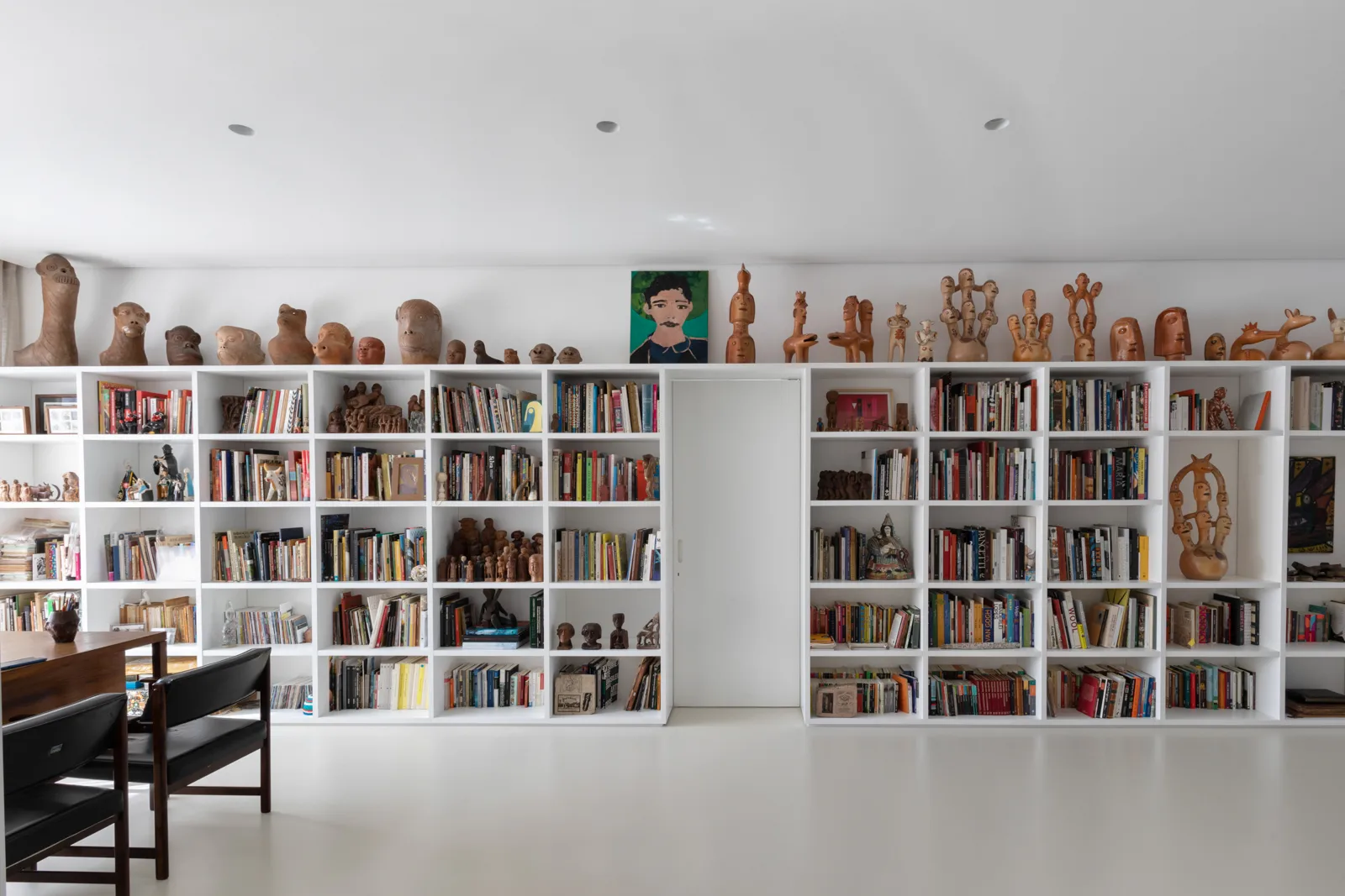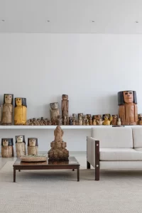 A grande estante funciona como o único filtro físico do espaço, abrigando o acesso às suítes, enquanto o restante do apartamento se mantém fluido e integrado. Paredes brancas e piso contínuo de resina clara servem como fundo neutro para a coleção, com acentos pontuais de madeira, pedra e mobiliário vintage. A ausência de hierarquia entre as obras se reflete na concepção espacial: um conjunto único, pensado para crescer junto com a coleção e permanecer acessível aos visitantes.