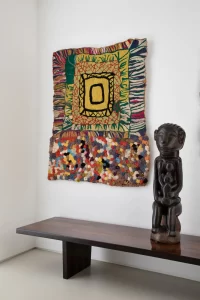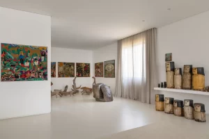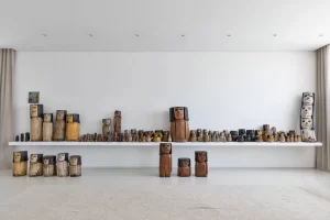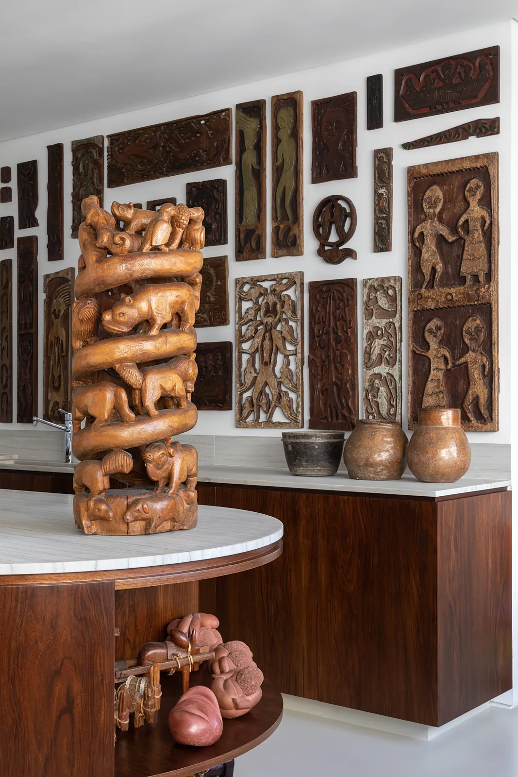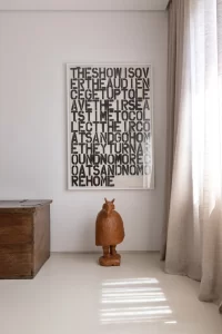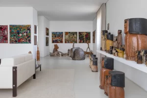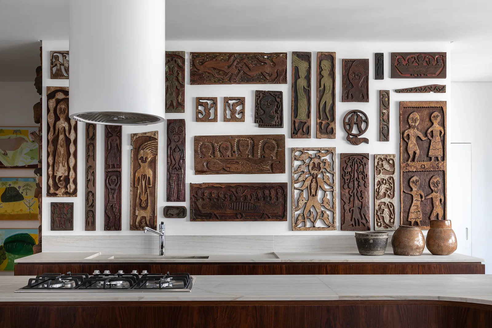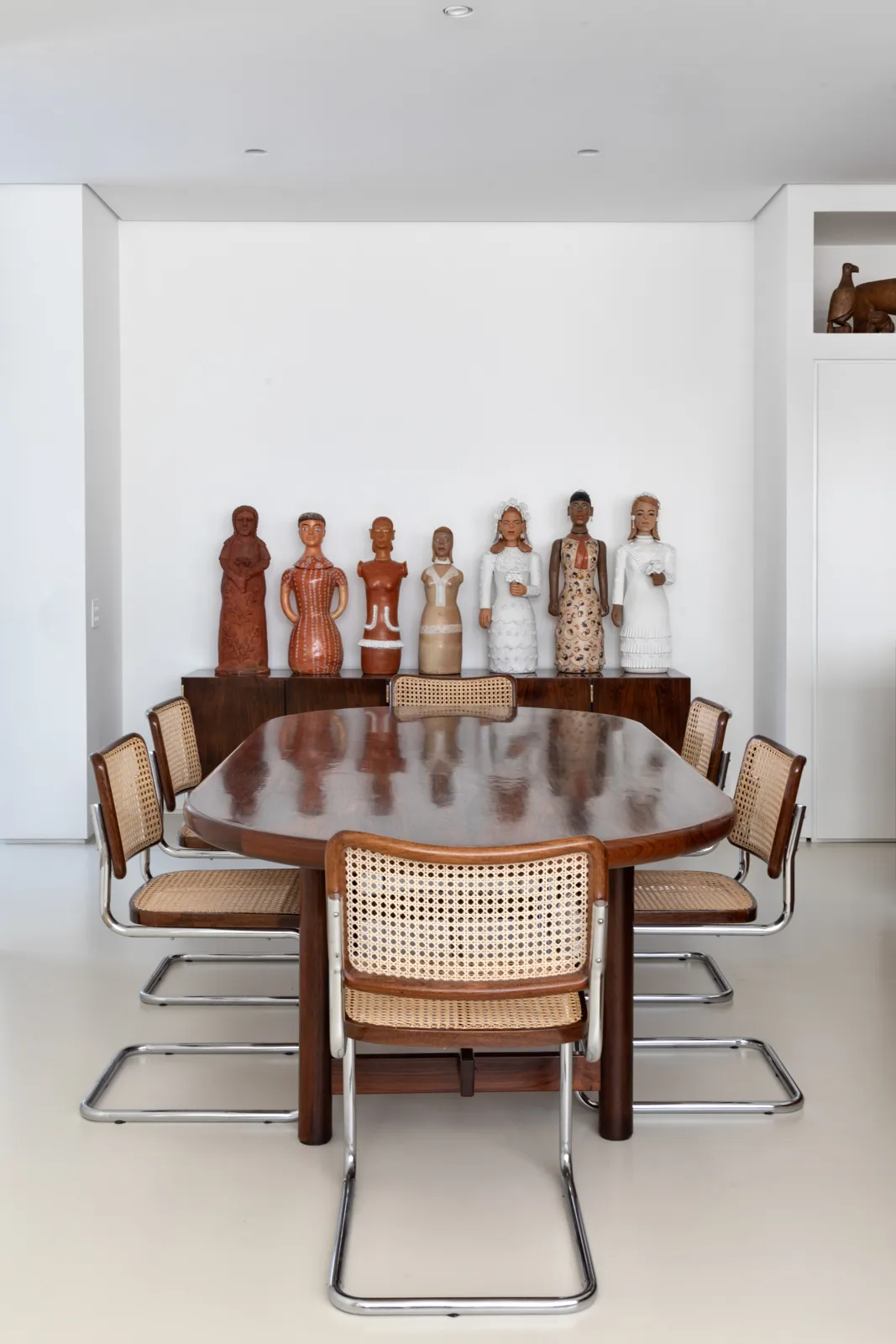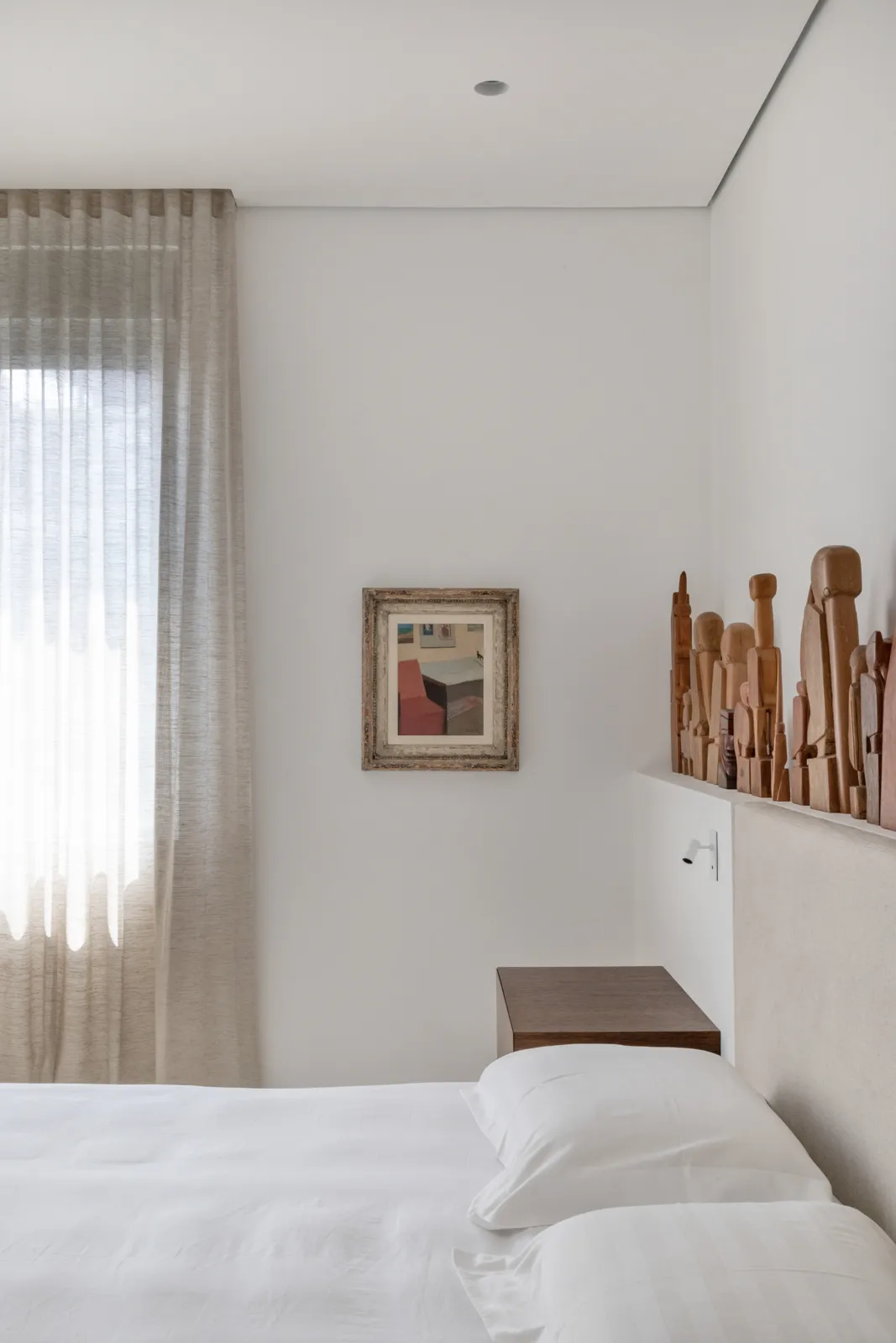 A grande estante funciona como o único filtro físico do espaço, abrigando o acesso às suítes, enquanto o restante do apartamento se mantém fluido e integrado. Paredes brancas e piso contínuo de resina clara servem como fundo neutro para a coleção, com acentos pontuais de madeira, pedra e mobiliário vintage. A ausência de hierarquia entre as obras se reflete na concepção espacial: um conjunto único, pensado para crescer junto com a coleção e permanecer acessível aos visitantes.