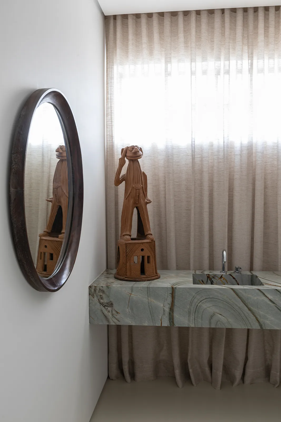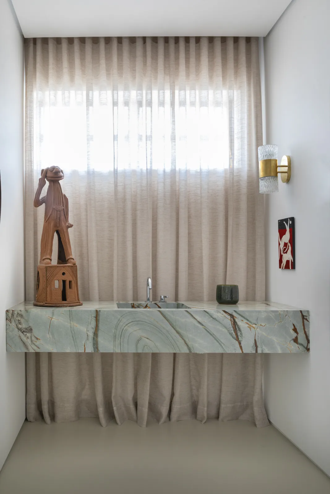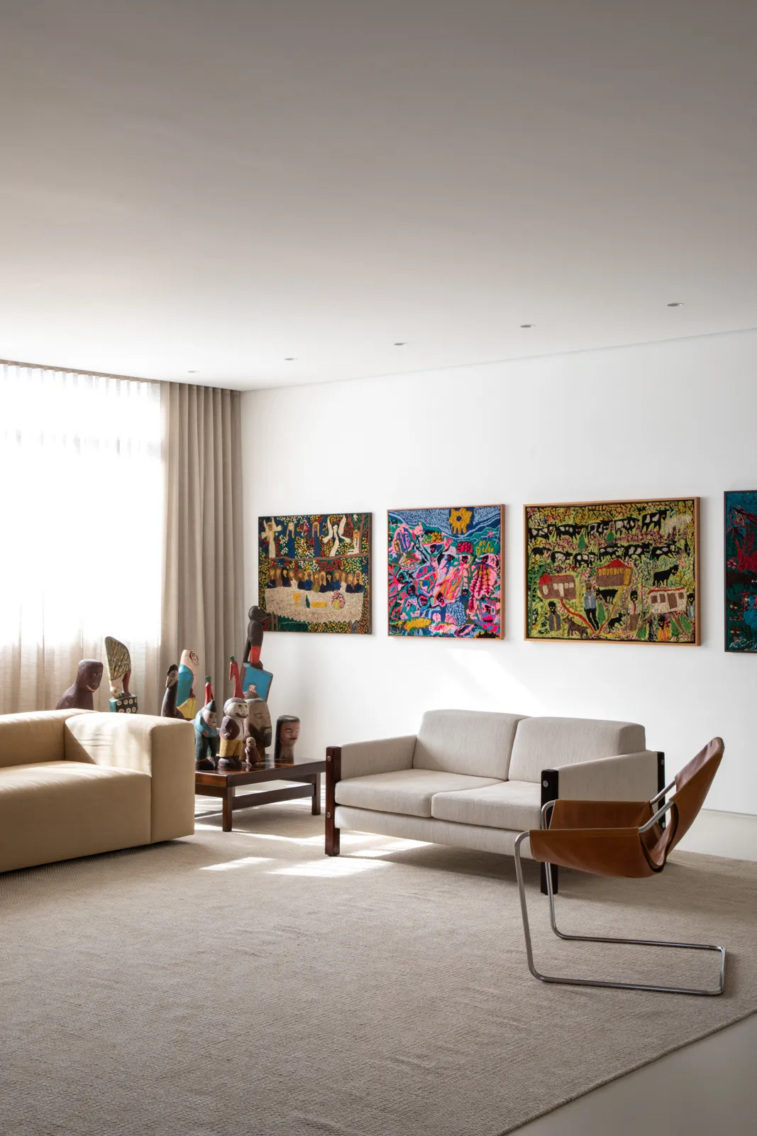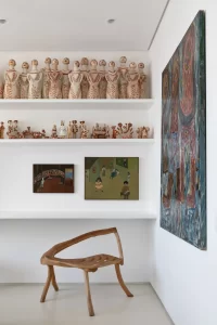 Com a intenção de abrigar não apenas o novo morador, mas também sua crescente e singular coleção de arte popular brasileira, este apartamento de 370 m² passou por uma renovação completa, espacial e material. O projeto parte da necessidade de integrar séries de obras à própria arquitetura, incorporando-as desde o dimensionamento das paredes até estantes, biblioteca e cabeceira do dormitório.